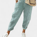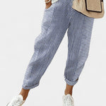 La comodidad y el estilo se unen en estos pantalones a rayas: una opción ideal para días cálidos y looks sin esfuerzo. Confeccionados en una mezcla de lino transpirable y con un ajuste relajado, ofrecen ligereza y confort durante todo el día sin perder un aire pulido. La cintura elástica con cordones ajustables permite un ajuste flexible, y los bolsillos laterales aportan practicidad para el uso diario. Dentro del universo de Martina Madrid, es ese básico veraniego que resuelve outfits con facilidad.