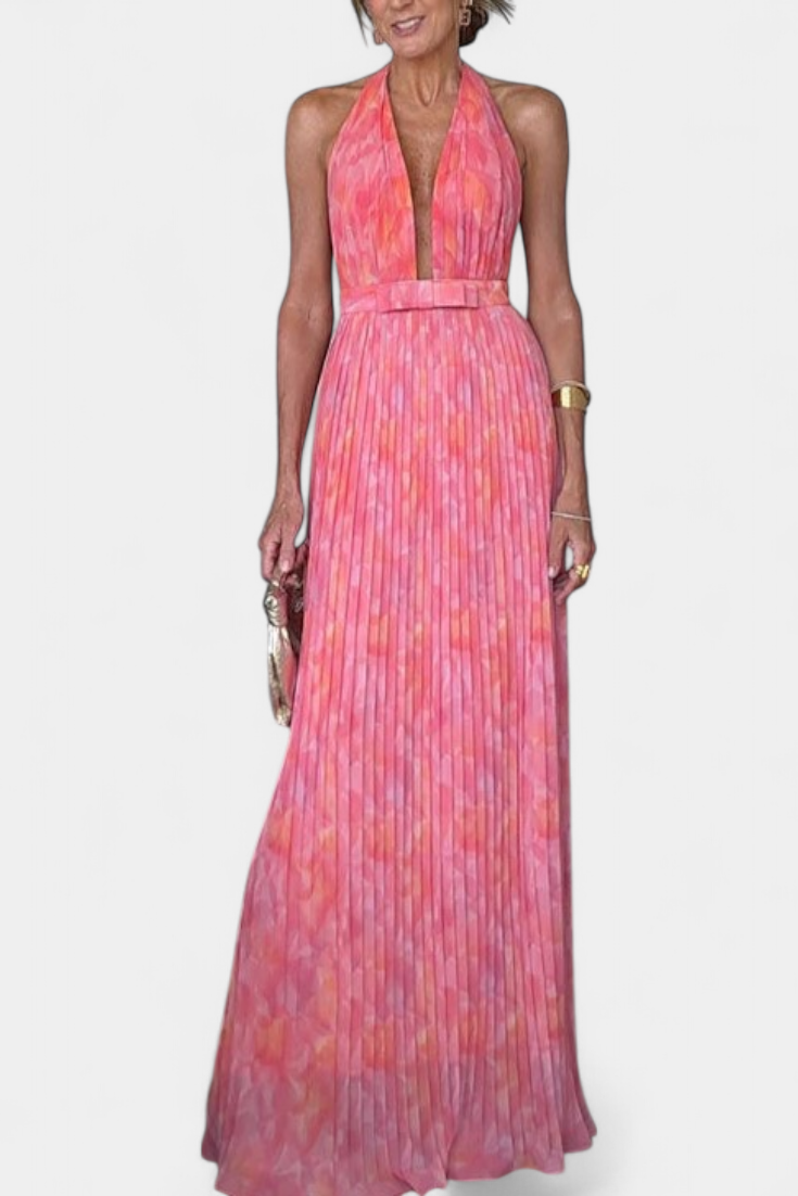 Prisca Vestido Maxi Plisado con Espalda Abierta y Cuello Halter